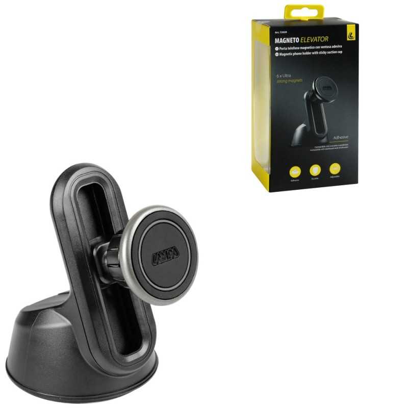 Compact design with height and viewing angle adjustment. Anti-slip and anti-scratch silicone coated magnet. Compatible with phones, smartphones, GPS, phablets... Adhesive suction pad for optimum grip on windshields and dashboards.