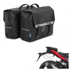 Alforjas con capacidad de 25 litros por bolsa, se montan de forma rápida y fácil a través de la fijación side bag holder o a través del sistema de correas universal. Cuentan con bolsillos internos para guardar pequeños enseres e incluyen también dos correas que aseguran su estabilidad en el uso a la vez que permiten fijar carga adicional encima de la bolsa.